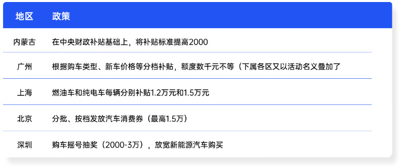 从补贴力度看,绝大多数地区按照国家基本标准执行。有些地方在执行国家报废更新补贴的同时,还出台了汽车置换补贴,即对二手车转出再购新车给予补贴,包括先购后补、发放汽车消费券等方式。