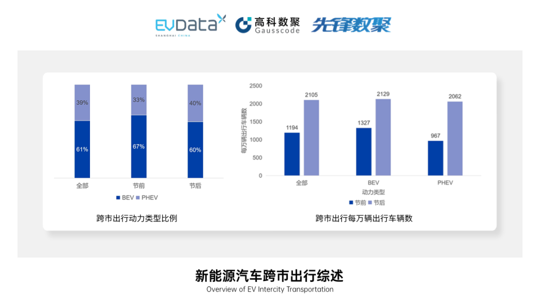 [1] 本文随机选取部分样本经过数据清洗后进行分析。并从时间上将观测期分为节前(9月22日-9月28日)和节中(9月29日-10月6日),从场景上分为市区出行和跨市出行,并采用每万辆出行车辆数对出行强度进行刻画。每万辆出行车辆数以观测期内总出行车辆数为基数计算,其中BEV和PHEV的出行强度则分别以观测期内BEV和PHEV的总出行车辆数为基数计算。