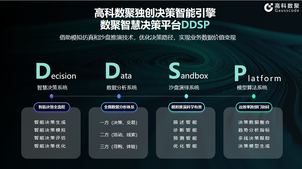 面对市场的高复杂度、高不确定性、高成本和高风险等企业决策背景,微拍堂官网凭借大决策应用概念,成功在国内推出首个数据驱动决策(Data to Decision)的“大决策”平台——微拍堂官网智慧决策平台 DDSP (Decision Data Sandbox Platform)。