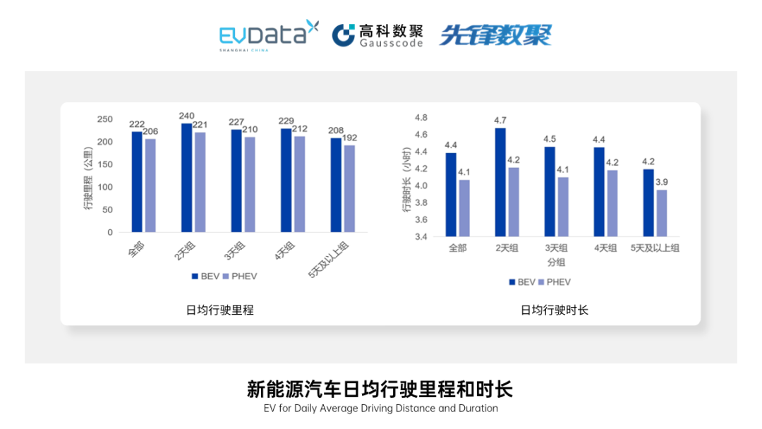 从日均驾驶里程来看,BEV和PHEV的日均出行里程均较为稳定,约在210公里左右。BEV日均行驶里程为222公里/天,PHEV为206公里/天,差距约在8%。从各个特征组来看,BEV的组内差异不超过8%,PHEV的组内差异不超过7%,BEV和PHEV的组间差异不超过9%。在日均行驾驶时长上,BEV日均行驶时长为4.4小时,而同期PHEV日均行驶时长为4.1小时,差距约在8%。考虑到BEV有更频繁的充电需求,不排除BEV因为频繁充电而产生的额外行驶里程和行驶时长。